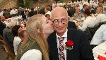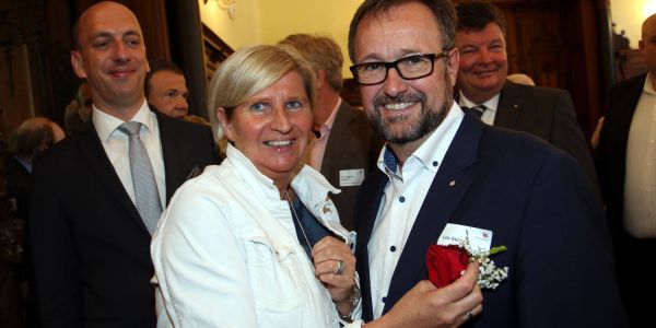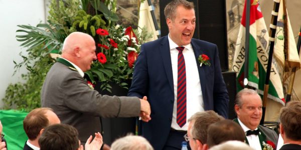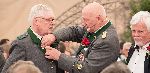Udo Stein vom Wirtschaftsverein bekommt von Königin Birgit Wöckener eine rote Gilde-Rose an das Revers gesteckt. Foto: Christian Bittcher