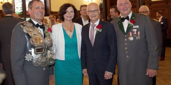 Gildekönig Jörg Geffke und 1. Patron Ingo Mönke nehmen Peter Tschentscher und Sophie Fredenhagen in die Mitte. Foto: Christian Bittcher
