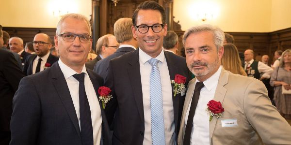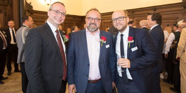 Christian Weber (Mitte), Chef von HC Hagemann, mit Holger Jopek (l.) und Florian Kairat, beide Mercedes, beim Empfang im Rathaus. Foto: André Zand-Vakili