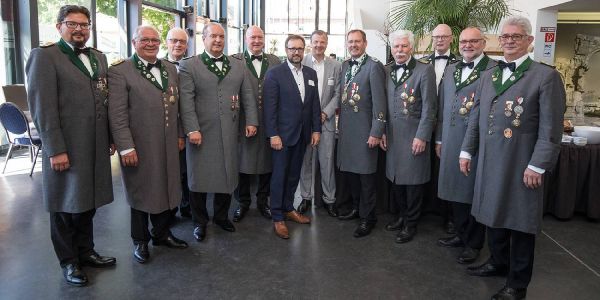 Vor dem Ausmarsch gab sich die Deputation der Harburger Schützengilde mit König Jörg Geffke beim Frühstück des Wirtschaftsvereins die Ehre, wo sie von Arnold G. Mergell und Udo Stein begrüßt wurden. Foto: André Zand-Vakili