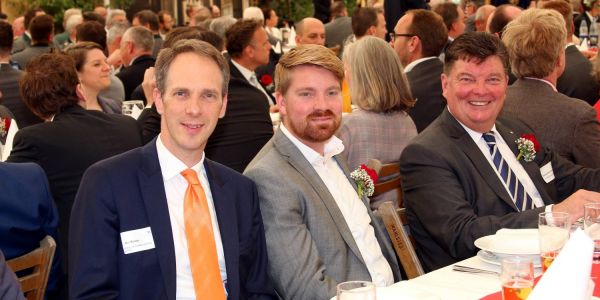Beim Spargelessen im Festzelt am Tisch des Wirtschaftsvereins: Jan Busse (links) sowie Nils und Bernd Westermann. Foto: Christian Bittcher