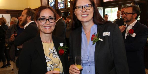 Die Centermanagerinnen Volbone Scharfenberg (links, Marktkauf Center) und Melanie Wittka (Harburg Arcaden) beim Empfang im Rathaus. Foto: Christian Bittcher