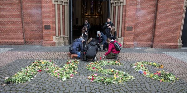 Vor dem Mariendom haben Schüler Blumen in Form der Buchstaben NSG für Niels-Stensen-Gymnasium niedergelegt. Foto: André Zand-Vakili