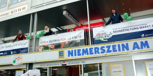 An einem Info-Stand von BID Sand-Hölertwiete und der steg (Stadterneuerungs- und Stadtentwicklungsgesellschaft Hamburg) konnten sich die Besucher über die bevorstehenden Bauvorhaben informieren. Wie berichtet wird der Sand im nächsten Jahr modernisiert, und der Wochenmarkt zieht für die Dauer des Umbaus auf den Harburger Rathausplatz um. Als sichtbares Zeichen des Umbaus wurden drei Transparente an dem Durchgang oberhalb der Markfläche angebracht. (cb)
