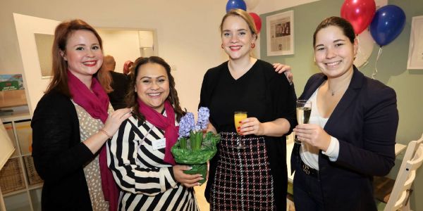 Rebecca Kühlmorgen (v.l.) und Demi Akpinar begrüßen Antonia Marmon und Louisa Knipschild vom Harburg Marketing. Foto: Christian Bittcher