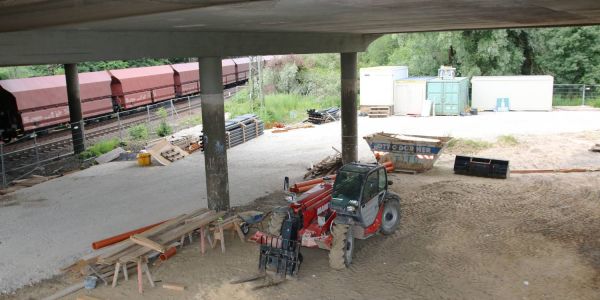 etwa drei Wochen pausieren die Arbeiten auf der Baustelle. Bereits im März wurde wie berichtet mit dem Bau der Behelfsbrücke für Fußgänger und Radfahrer begonnen. Doch jetzt ruhen die Arbeiten an der Stahl-Holzkonstruktion, die schon etwa halb fertig ist und bereits die ersten beiden Gleise der Bahnstrecke überspannt.
