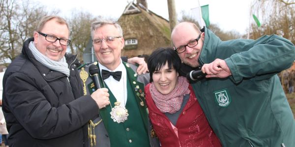 Freude über das gelungene Spektakel die Moderatoren Jan Stahl (links) und Jojo Tapken nehmen die Wettpaten in die Mitte. Foto: Christian Bittcher
