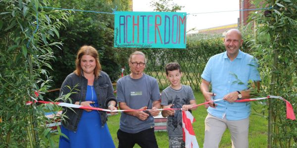 Im Rahmen des ab sofort regelmäßig stattfindenden Elterncafes wurde der neue Raum seiner Bestimmung übergeben. Schulleiter Tobias Langer, Projektleiter Jörg Achterberg, der 13-jährige Schüler Emanuel und Schulsozialarbeiterin Sarah Sieronski griffen zur Schere und schnitten das Absperrband durch. Gleich darauf durften die Besucher des Elterncafes erstmals in dem lebenden Lernort Platz nehmen. Die provisorischen Bänke und Sitzkisten sollen demnächst noch durch wetterfestes Klassen-Mobiliar ausgetauscht werden.
