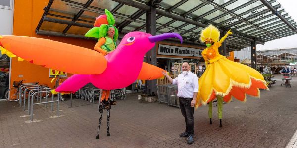 Bei OBI wurden die Kunden von frühlingsbuten Stelzenläufern empfangen. Foto: André Zand-Vakili