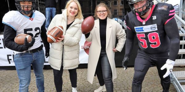 Antonia Marmon und Luca Büttner mit zwei Spielern der Hamburg Ravens. Foto: Christian Bittcher