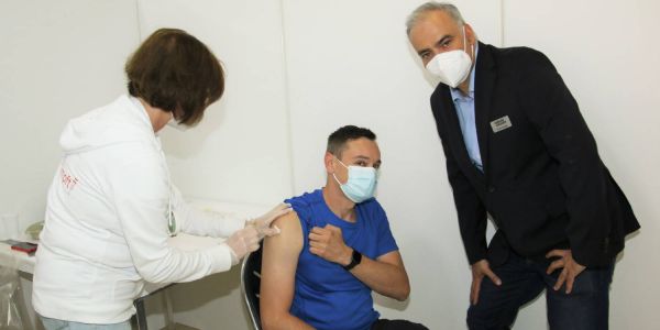 Centermanager Sevket Demir (rechts) war bei der Impfung des 42-jährigen Jack aus Harburg dabei. Foto: Christian Bittcher