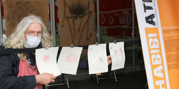 Erfolgreiche Kunstaktion: Sly vom Habibi Atelier mit einigen der von Kindern gemalten Corona-Monster. Foto: Christian Bittcher