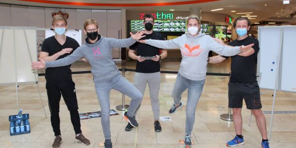 Die Tus-Harburg-Trainer Frederik, Jonathan und Christian helfen Centermanagerin Julita Hansen und ihrer Kollegin Claudia Theisel bei den Übungen für das "Europäische Fitnessabzeichen". Foto: Christian Bittcher