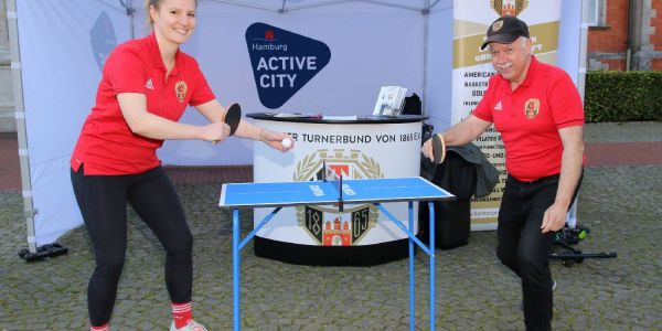 Mini-Tischtennis mit dem HTB: Carla Rook und Torsten Schlage in Action. Foto: Christian Bittcher