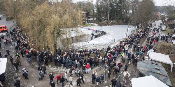 Schützenkönig Arne Wichers trafen sich trockenen Fußes auf dem Feuerteich: Wette gewonnen! Auch in ihrer 17. Auflage hat die Marmstorfer Teichwette nichts von ihrer Anziehungskraft eingebüßt - im Gegenteil: Mehr als 2000 Besucher kamen bei fast trockenem Wetter am Sonntag-Vormittag zum Teich im Alten Marmstorfer Dorfkern um bei der Gaudi für einen Guten Zweck dabei zu sein.