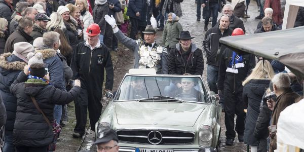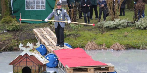 Während Carsten Pape - begleitet der von seinem neuen Musikpartner Elvis - den Seeweg im Mini-HSV-Stadion, das komplett ausgerüstet mit Fans, Fahne, Tor und Elfmeterraum war, zur Teichmitte wählte, wurde für Arne Wichers von seinen Schützenkameraden ein Laufsteg gezimmert. Sogar ein roter Teppich wurde in Windeseile auf dem Steg verlegt.