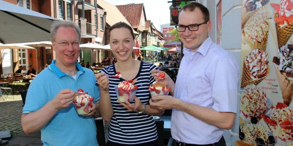 Ein kühles Eis in der Mittagspaus: Kai (links), Simone und Eugen kamen aus dem Channel Hamburg in die Lämmertiwete. Foto: cb