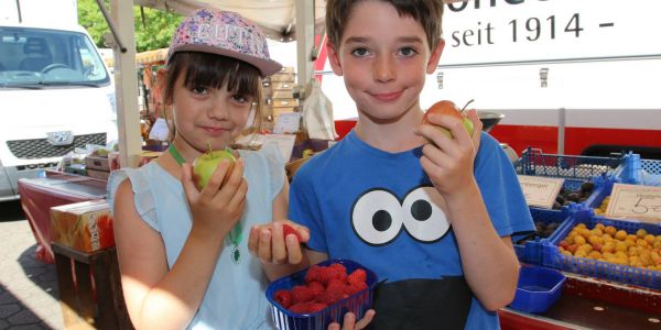 Milena (6) und Maximilian (8) erfrischen sich auf dem Harburger Wochenmarkt mit frischem Obst. Foto: cb