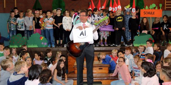 Schulleiter Andreas wiedemann griff zur Gitarre und sorgte für Stimmung in der Sporthalle. Foto: Christian Bittcher