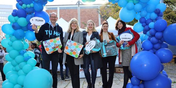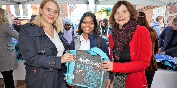 Zu denjenigen, die die Taschen an die Ersties verteilten gehörten auch Bezirksamtsleiterin Sophie Frendenhagen, Prof. Dr.-Ing. Irina Smirnova, Vizepräsidentin Forschung an der TUHH, und Sandra Becker, Regionalbereichs-Direktorin der Sparkasse Harburg-Buxtehude.