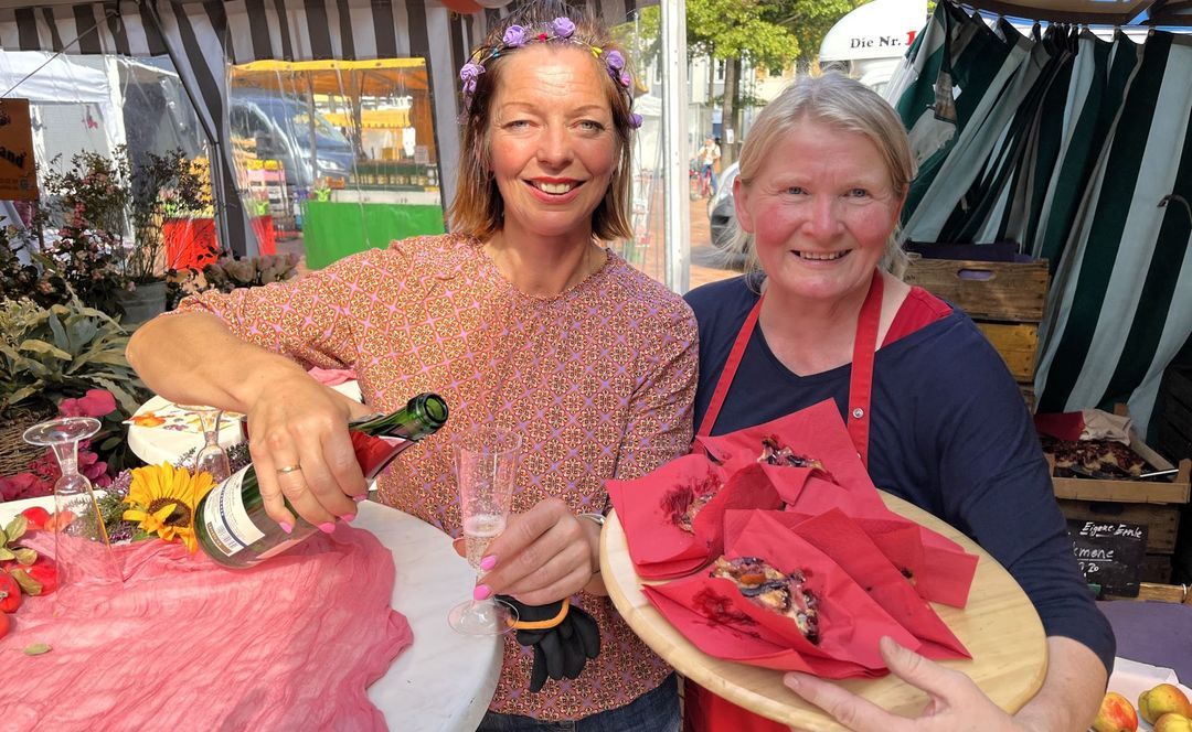 Bei Simone Micheel und Ingrid Holst gab es Sekt und Pflaumenkuchen für die Kunden. Foto: cb