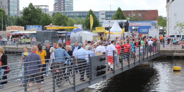 Die Besucher strömen über die Drehbrücke vom Kanalplatz zum Lotsekai Foto: cb