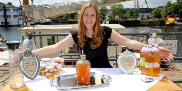 Der kleinste Stand auf dem Fest: Maxi-Katharina Weinrich verkauft Holunderblüten-Sirup und Gelee aus eigener Herstellung. Foto: Christian Bittcher