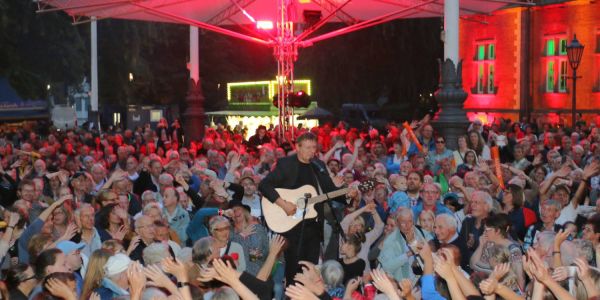 Premiere des Harburg Songs: Peter Schuldt singt gemeinsam mit den Chören auf dem Rathausplatz. Foto: cb