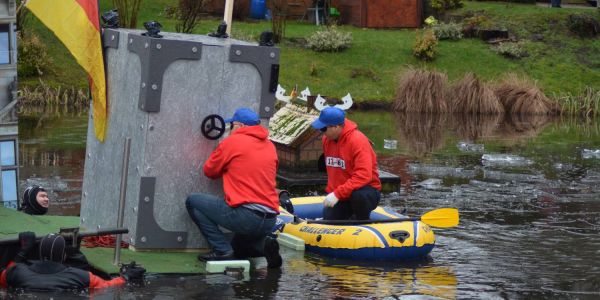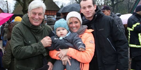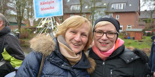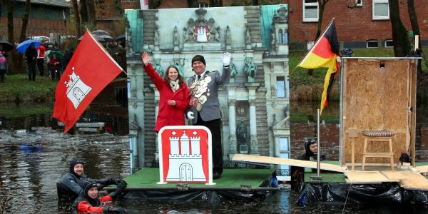 Regens lockte das Spektakel auf dem Feuerteich in Marmstorf gut 1500 Besucher an. Und die genossen unter ihren Regenschirmen die Leckereien vom Grill und aus der Gulaschkanone, bevor die Hauptakteure im "Königsmobil" vorgefahren wurden. Hamburgs Sozialsenatorin Melanie Leonhard und Marmstorfs Schützenkönig Torsten Czerner traten gegeneinander an. Die Wette: Beide müssen sich trockenen Fußes in der Mitte des Feuerteichs treffen.