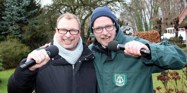Spaß am Mikro: Jan Stahl und Jojo Tapken moderierten die Teichwette. Foto: Christian Bittcher