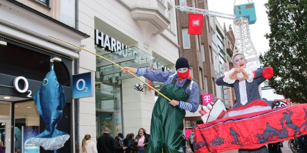 Die Stelzenläufer gehören einfach dazu. Dieses Mal repräsentierten sie die Hansestadt Hamburg mit Kränen und Angler. Foto: Christian Bittcher