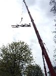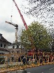 Stück für Stück wurde der Baukran des fast fertigen Neubauvorhabens in Höhe Hausnummer 107 in luftiger Höhe auseinander genommen und mit einem knapp 50 Meter hohen Telekran über die Dächer der neuen Häuser hinweg auf die Fahrbahn des Hainholzwegs gehievt.