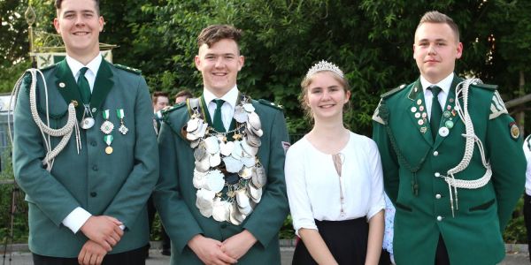 Neuer Jungschützenkönig wurde der 16-jährige Mirco Lingsteding. Ihn werden Prinzgemahlin Klara Drope und die Adjus Manuel Polley und René Lingsteding (links) durch das Königsjahr begleiten. Foto: Christian Bittcher