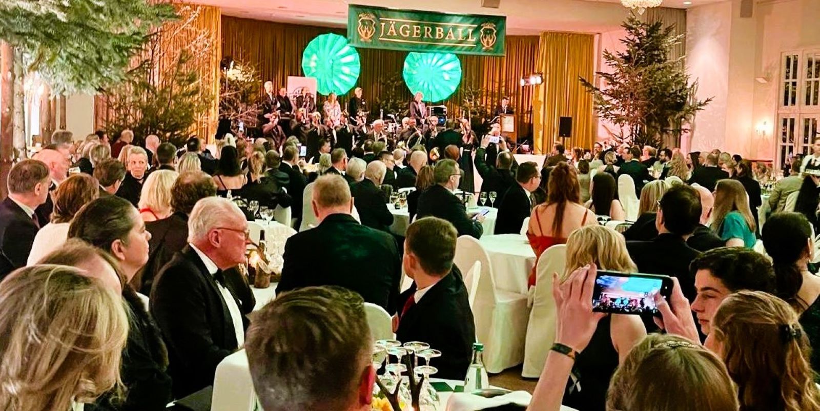 Zahlreiche Bäume und großformatige Jagdmotive verliehen dem Saal den Charakter einer Waldlichtung. Auch das Foyer war mit frischem Grün sowie verschiedenen Wildtierpräparaten ausgestaltet und unterstrich den jagdlichen Charakter der Veranstaltung.