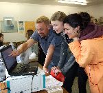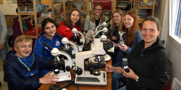 Gemeinsam mit Algenexpertin Diana Rieger untersuchen die Schüler die ersten Wasserporben. Foto: Christian Bittcher