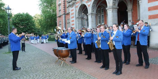Der Große Zapfenstreich wurde gespielt vom Blasorchester Seevetal (vorn) und dem Spielmannszug der Turnerschaft Harburg. Foto: Christian Bittcher
