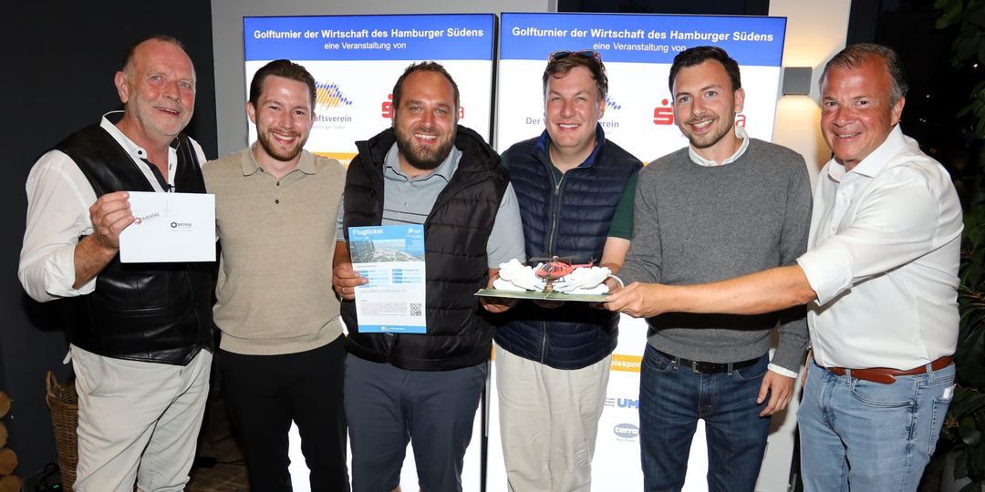 Großen Jubel gab es beim Sieger-Flight mit Fynn Warrings (Mercedes-Benz AG), Florian Kossin (Eiko Lohnunternehmen GmbH), Florian Watermann (Watermann-Immobilien.de) und Philipp Schendel (Miske & Loeck Assekuranz Makler GmbH). Das Siegerteam freut sich über einen gemeinsamen Helikopterflug über Hamburg. Der Hauptpreis wurde von IMENTAS Immobilienpartner GmbH zur Verfügung gestellt und von Heinrich Wilke übergeben.