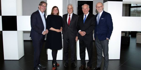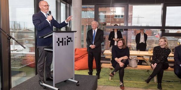 Am riesigen HIP-Logo: TU-Präsident Ed Brinksma, Senatorin Katharina Fegebank, Ex-Senator Frank Horch, Arne Weber und Senator Michael Westhagemann. Foto: Christian Bittcher