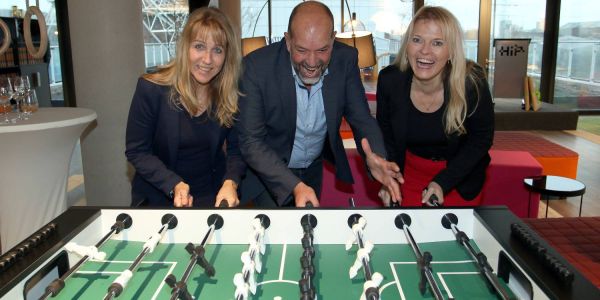 Spaß am Tischkicker: Britta Bünning und Sönke Knutzen von der TUHH in Aktion mit Citymanagerin Melanie-Gitte Lansmann. Foto: Christian Bittcher