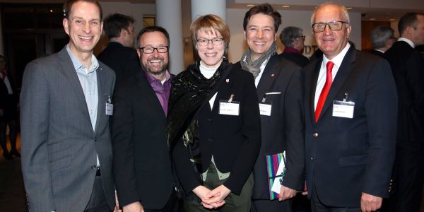 Thorsten Römer (Harburger Museum, von links), Udo Stein (Wirtschaftsverein/Stein Plan und Werk), Sozialdezernentin Anke Jobmann, Rainer-Maria Weiss (Harburger Museum) und Jochen Winand (Wirtschaftsverein). Foto: Christian Bittcher