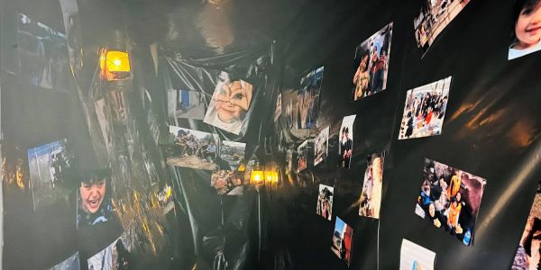 In einem kleinen dunklen Tunnel werden die Fotografien von Faezeh Najafi gezeigt. Die Fotos dokumentieren das Leben in lebensgefährlichen Flüchtlingslagern und bedrückenden Notunterkünften auf ihrer Flucht nach Deutschland. Foto: Christian Bittcher