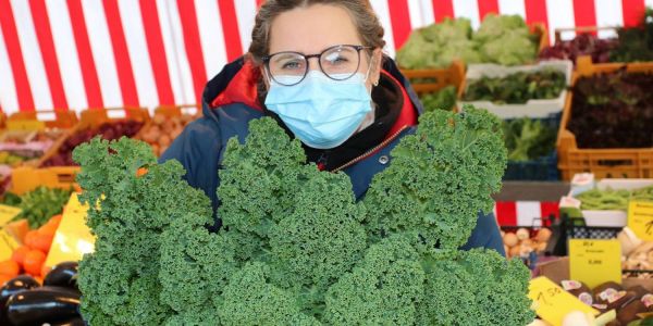 Wer Grünkohl einmal nicht auf traditionelle Weise zubereiten möchte, für den haben wir dass passende Rezept von Markthändlerin Ines Paro aus Bardowick bekommen: Kartoffel-Grünkohl-Suppe mit Chorizo, einer spanischen luftgetrockneten Rohwurst. „Das Rezept ist eigentlich mit einer Kohlwurst gedacht. Ich habe es von meiner Mutter bekommen, die ist im Landfrauenverein Brietlingen. Ich habe es dann mit der Chorizo abgewandelt, da sie im Geschmack besonders ist und man so die Tradition bricht, Grünkohl immer mit Kohlwurst zu essen“, sagt Ines Paro. Ines Paro vom Bardowicker Gemüsestand mit einer Grünkohl-Palme. Foto: Christian Bittcher